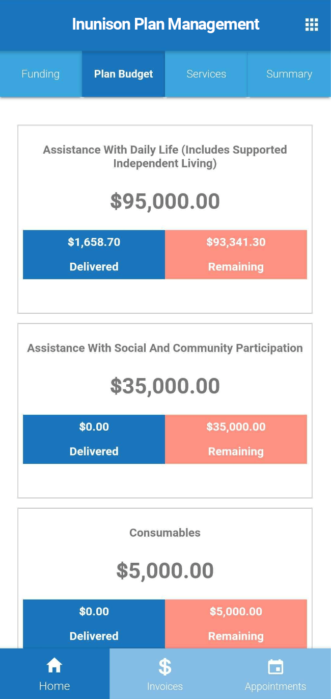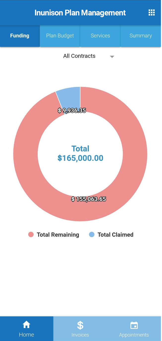 This is for the participant and is a mobile App. They can see full funding, approve/reject invoices if they wish and see all data associated with their plan.